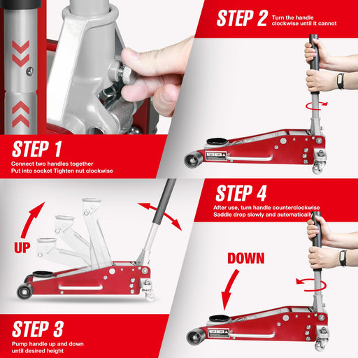 Jack Boss 3 Ton Low Profile, Aluminum and Steel Racing Floor Jack with Dual Pistons Quick Lift Pump for Sport Utility Vehicle, Lifting Range 3-15/16" min to 18-5/16" max, Net Weight 58.5 lb, Red