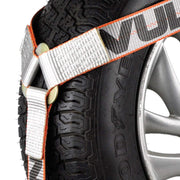 Details: Latching Snap Hook Provides A Secure Attachment Professional operators choose Vulcan automobile tie down systems to haul millions of vehicles every year Vulcan is recognized as the most qualified, most experienced, car tie down manufacturer in the world These tire harnesses are designed for use on wheel lifts and tow dollies Flat snap hooks are intended to mate easily with Hydra-Tech(r) and many other popular wheel lifts and tow dollies Heavy duty 2'' silver series tie down webbing is cut and UV resistant Hooks and d-rings are plated for maximum weather resistance Straps feature a full basket design for total tire coverage The circumference of the basket strap is 52" - please measure around your tire to make sure the strap will fit properly Safe working load is 1665 lbs. Meets all DOT requirements